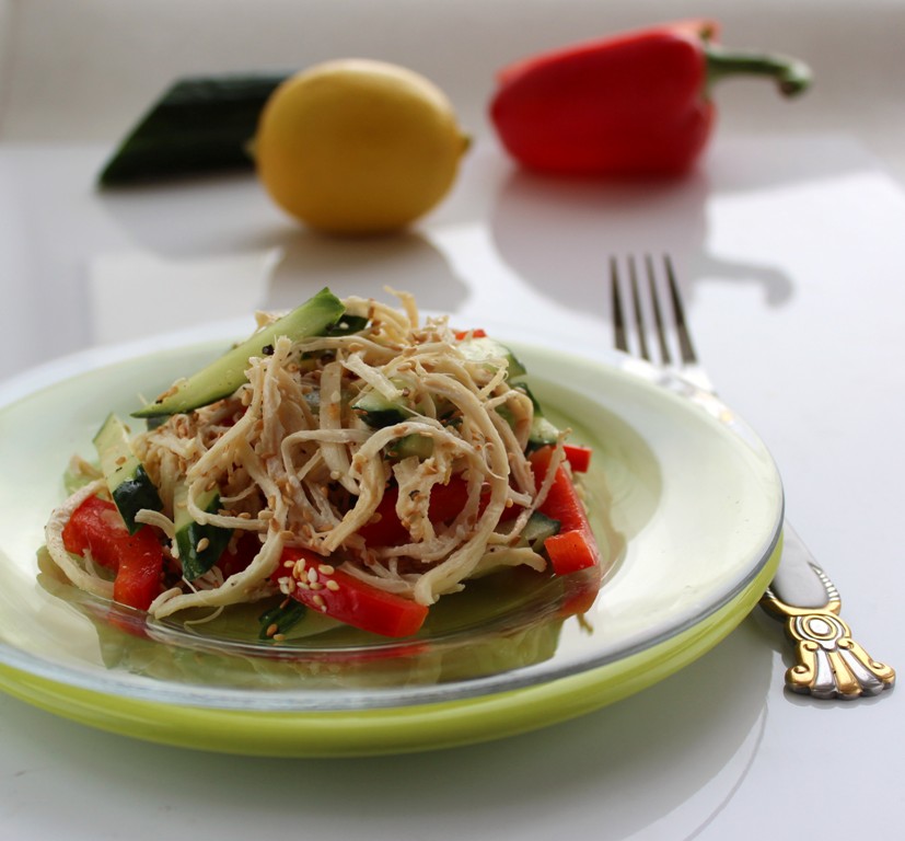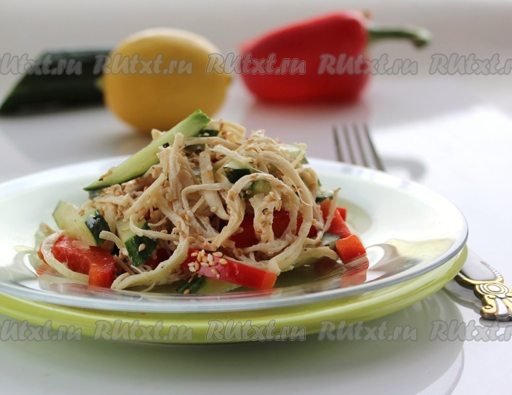 Выложить салат из куриной грудки и овощей в тарелку, посыпать кунжутом и подать к столу.