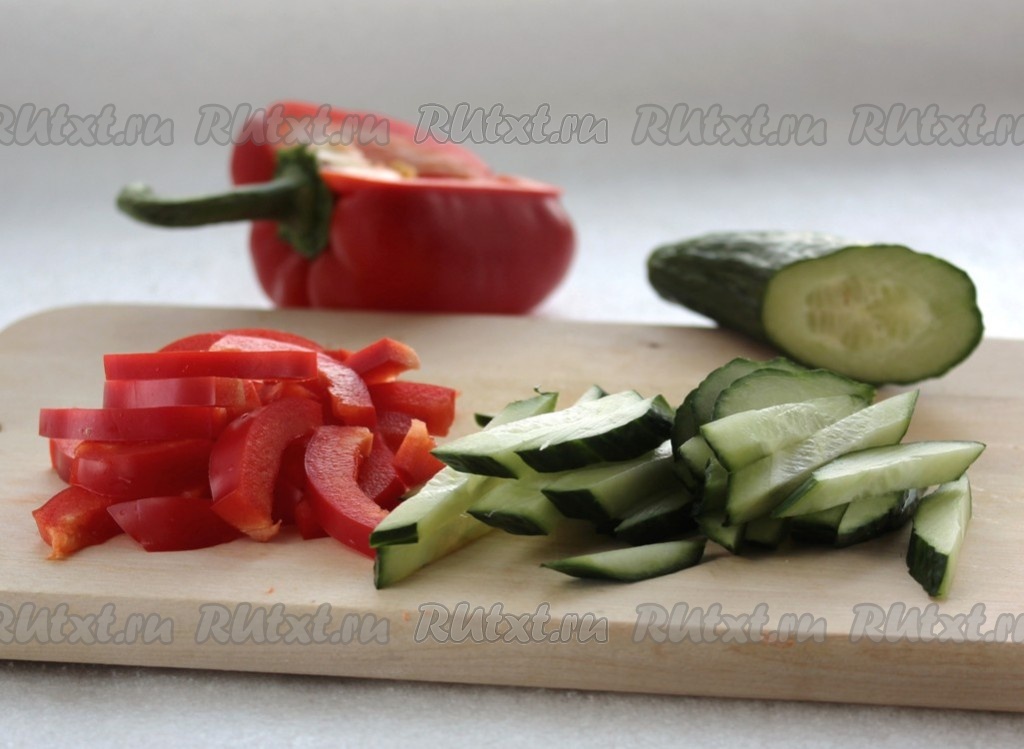 Нарезать соломкой красный перец и огурец.