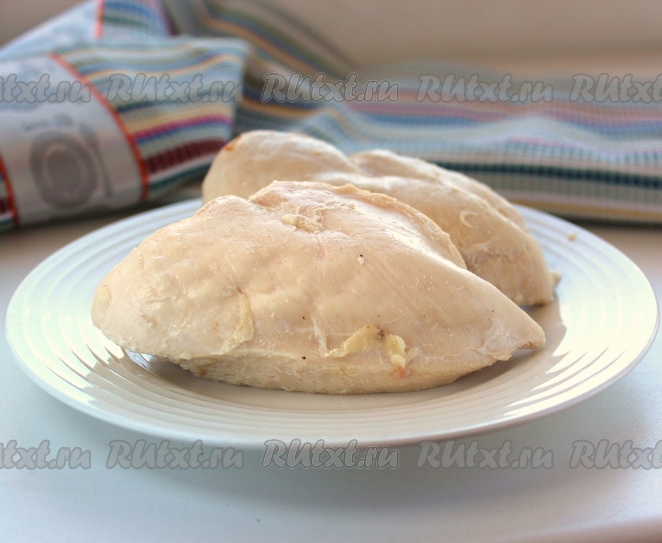 Отварить куриное филе в подсоленной воде в течение 20 минут с момента закипания, оставить остывать в бульоне