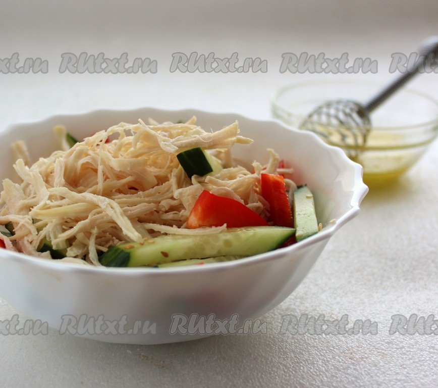 Смешать куриную грудку и овощи, посолить, поперчить, полить салат ароматной заправкой.