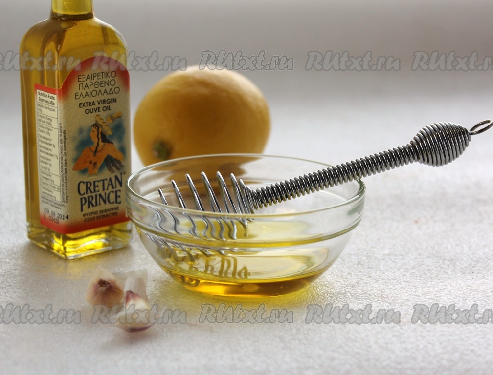Приготовить заправку для салата из куриной грудки и овощей. Измельчить чеснок и добавить его в смесь оливкового масла и лимонного сока, размешать.