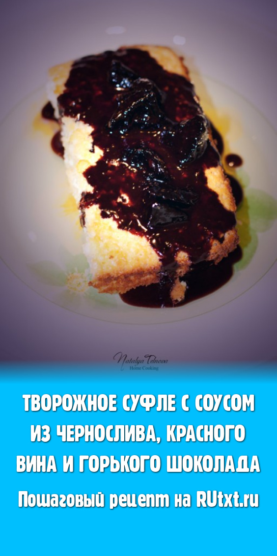 Творожное суфле нарезать порционно, полить соусом из чернослива, красного вина и горького шоколада и подать в теплом виде.