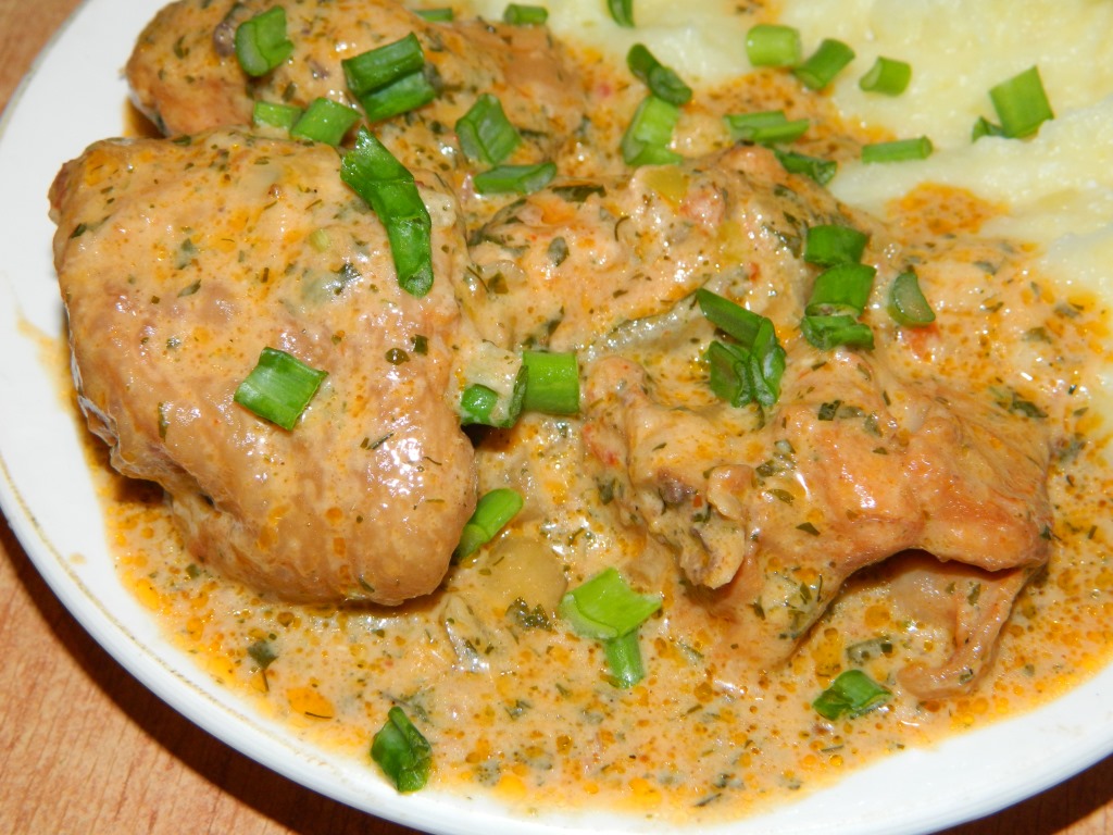 Вкусную курочку в сметанно-чесночном соусе, приготовленную в мультиварке, можно подавать с пюре. Приятного аппетита!