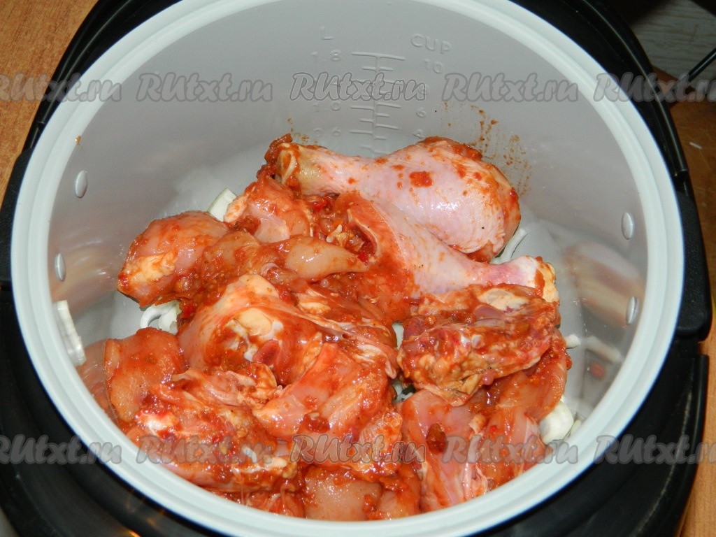 И курочку выложить поверх лука. Мультиварку выставить на режим "Выпечка" на 35 минут.