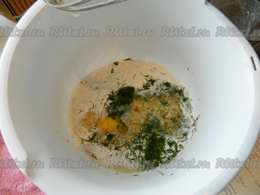 В запенившуюся дрожжевую смесь добавить соль, яйцо. Ещё я добавила нарезанный укроп, но это по желанию. Перемешать венчиком до однородности.