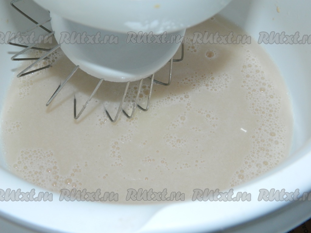 Развести дрожжи и сахар в тёплой воде (температура воды не должна превышать 40 градусов, чтобы дрожжи не погибли) и дать постоять в тёплом месте, пока смесь не запенится (на это потребуется минут 5-10).
