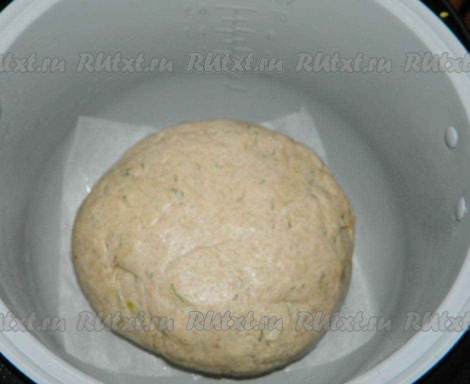 Чашу мультиварки смазать растительным маслом, на дно можно положить пергамент. Выложить в чашу тесто. Включить функцию "Мультиповар" на 10 минут, температуру поставить 40 градусов, крышку закрыть и оставить тесто подходить в мультиварке на 30-40 минут (в тёплой мультиварке оно быстрее подойдёт). Если в вашей мультиварке такого режима нет, то можно просто поставить тесто, прикрыв полотенцем, в тёплое место на 1 час. По прошествии времени тесто увеличится вдвое.