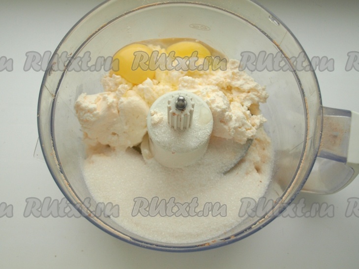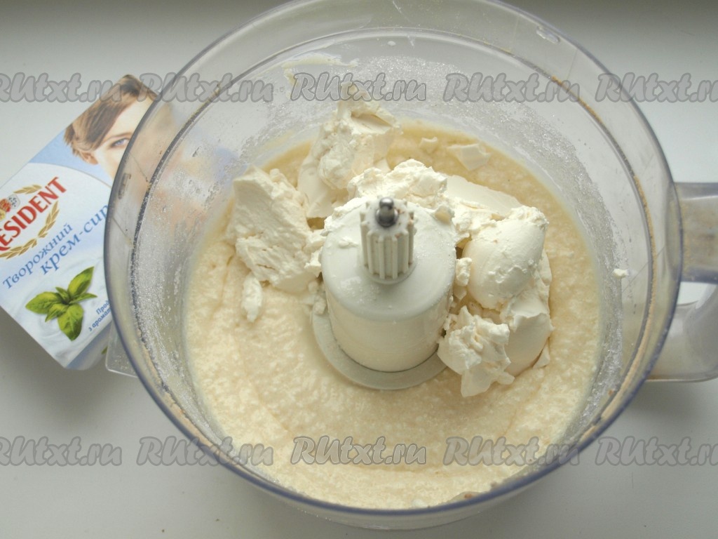Добавляем сливочный сыр и ещё раз взбиваем блендером. Осталось добавить муку и тщательно перемешать.