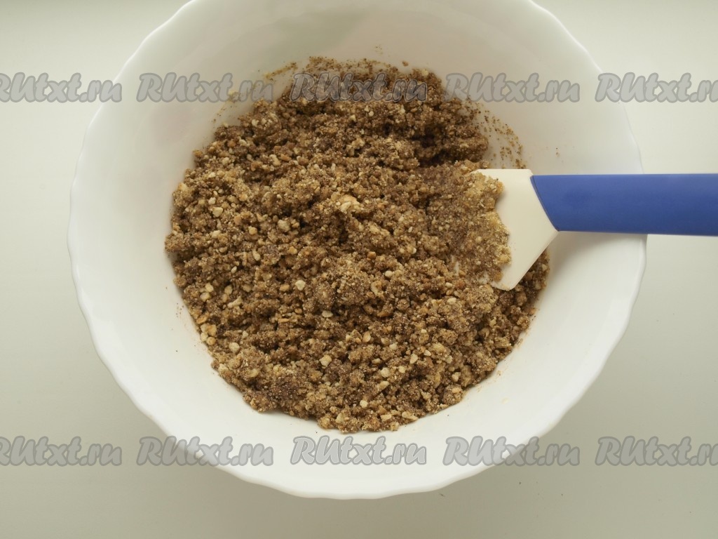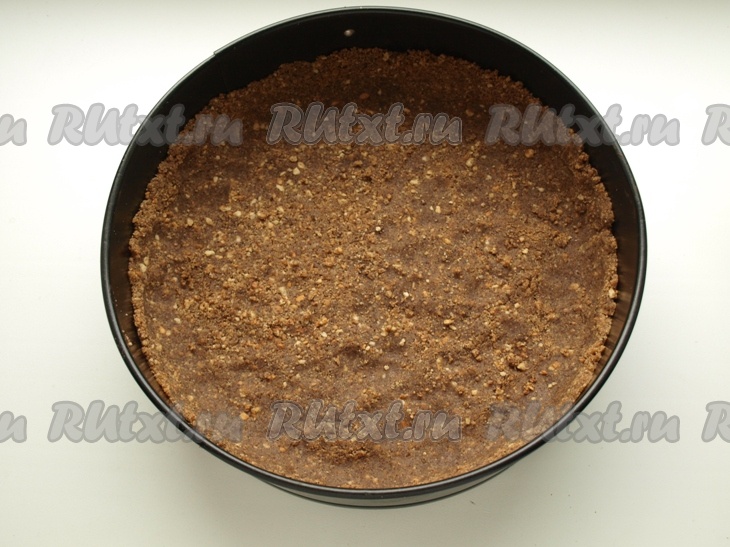 Сливочное масло растапливаем, даём немного остыть. Печенье, измельчённое в крошку, смешиваем с растопленным маслом, тщательно перемешиваем.