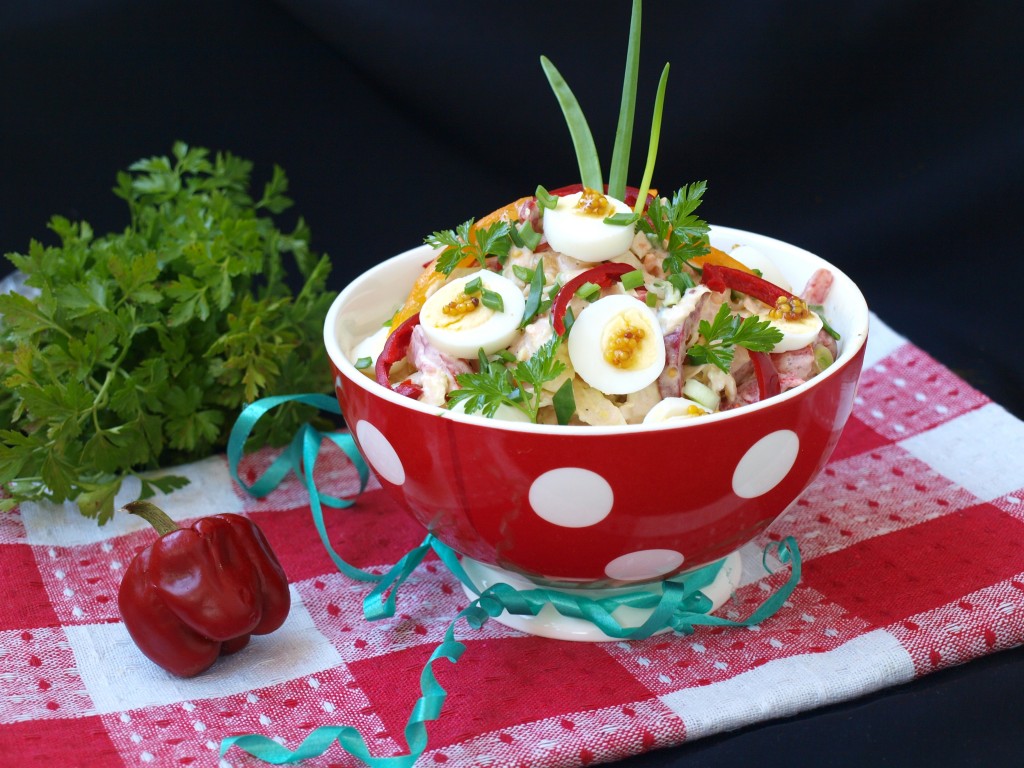 Очищенные перепелиные яйца нарезаем кружочками и аккуратно раскладываем поверх салата, понемногу украсив каждый кусочек яйца оставшейся горчицей. Выкладываем отложенные ломтики перца, хурмы, посыпаем салат зеленым луком и подаём к столу.