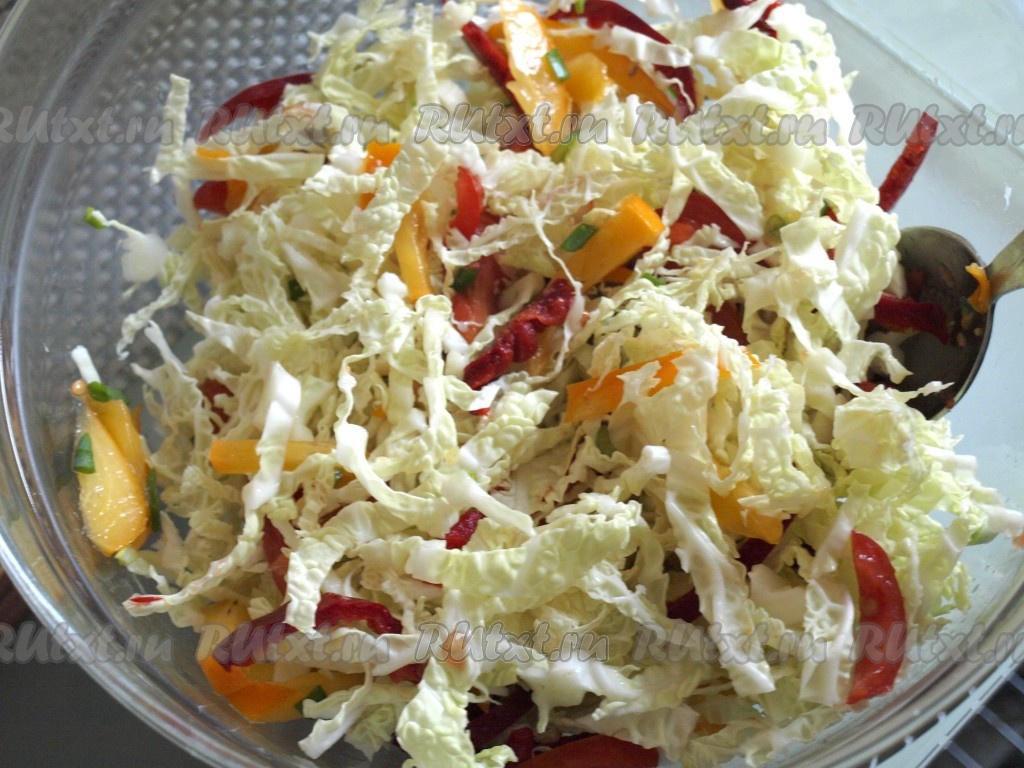 Савойскую капусту, болгарский перец, помидоры и лук соединяем с хурмой и тщательно перемешиваем салат.