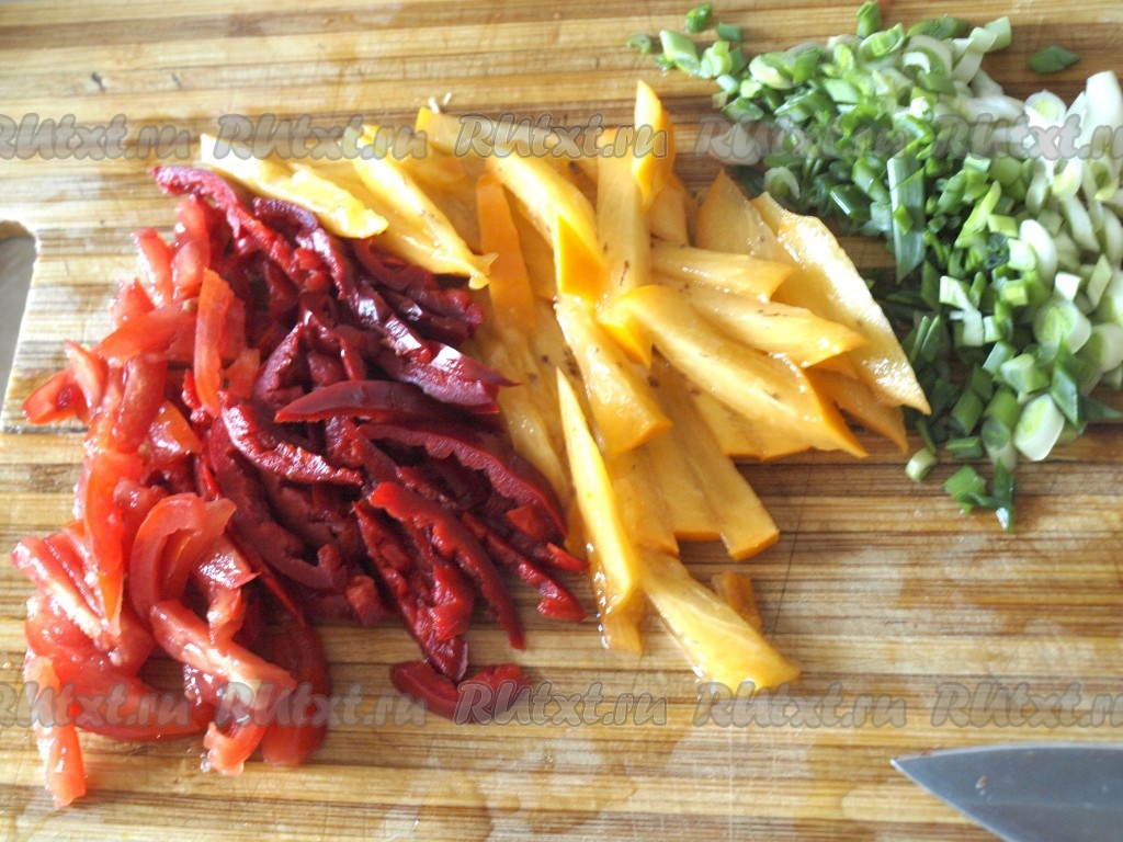 Болгарский перец, хурму и помидоры режем соломкой, мелко рубим зелёный лук. Немного перца, хурмы и зеленого лука оставляем для украшения.