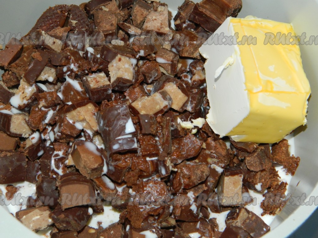Конфеты порубить, добавить какао, сливки и масло.