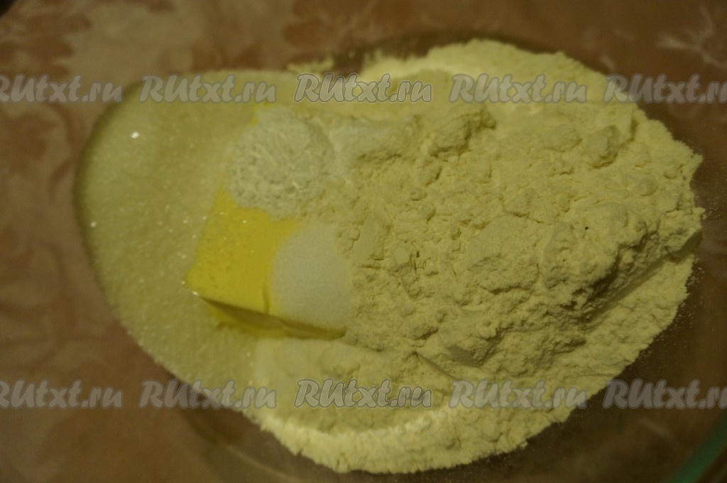 Отдельно приготовим песочное тесто, для этого сливочное масло комнатной температуры нужно соединить в миске с сахаром, солью, мукой и разрыхлителем.