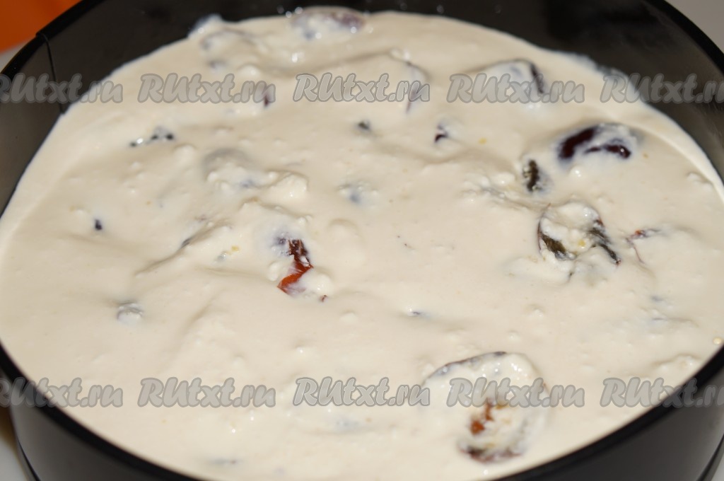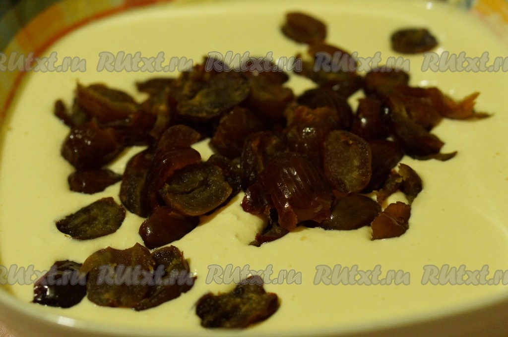 Вынуть из формы, переложить на тарелку, дать остыть. Вот такой пирог с творогом и финиками получился в разрезе.