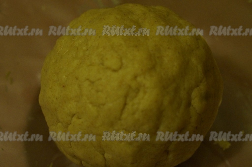 Влить 2 столовых ложки холодной воды, замешивая тесто и собирая его в шар. Если тесто не собирается в шар, тогда влейте ещё 1 столовую ложку воды. Тесто должно получиться мягким, не липнущим к рукам и поверхности.