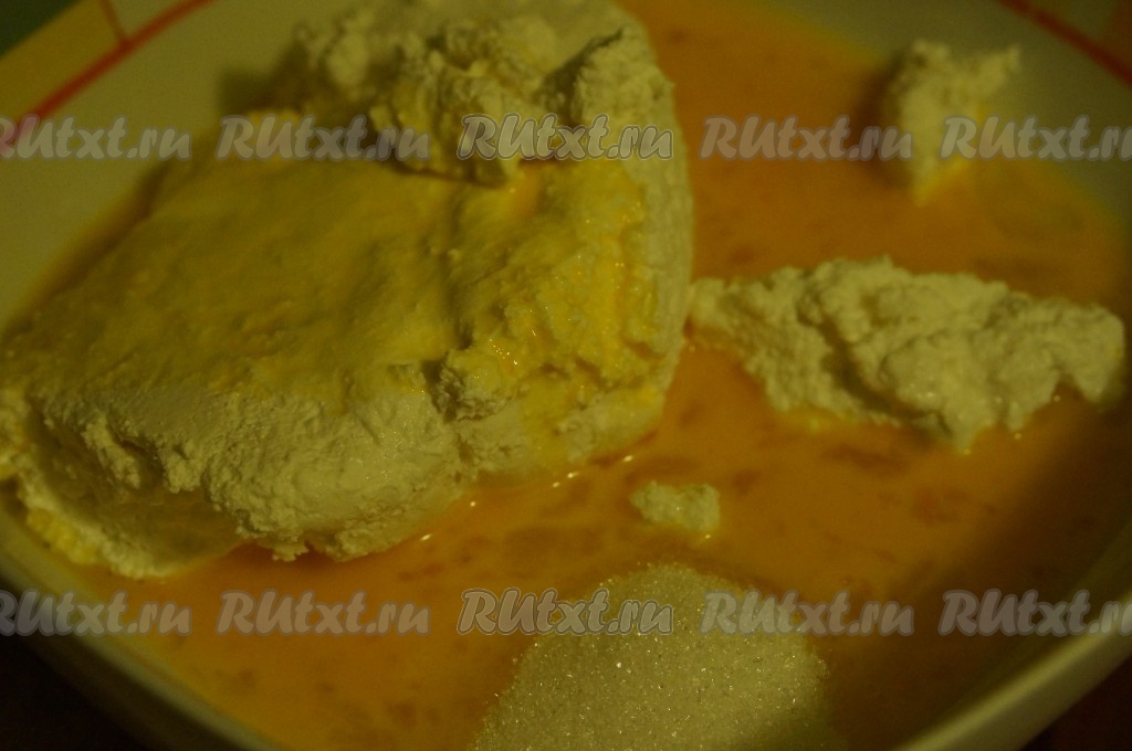 Творог перемешать с 2 столовыми ложками сахара и яйцами до однородности.