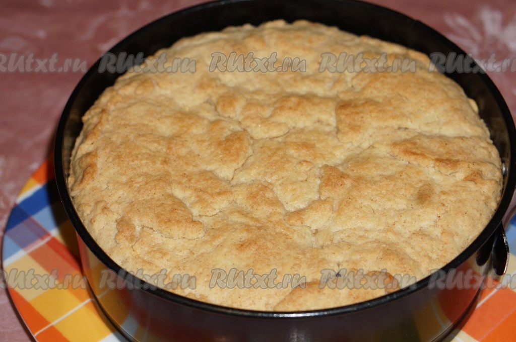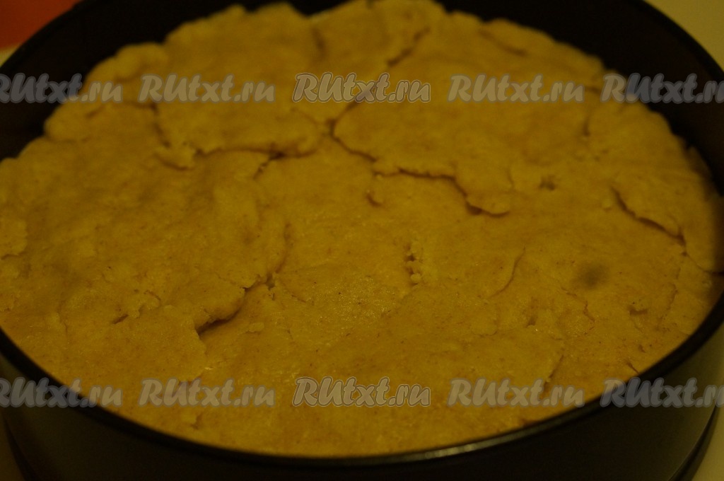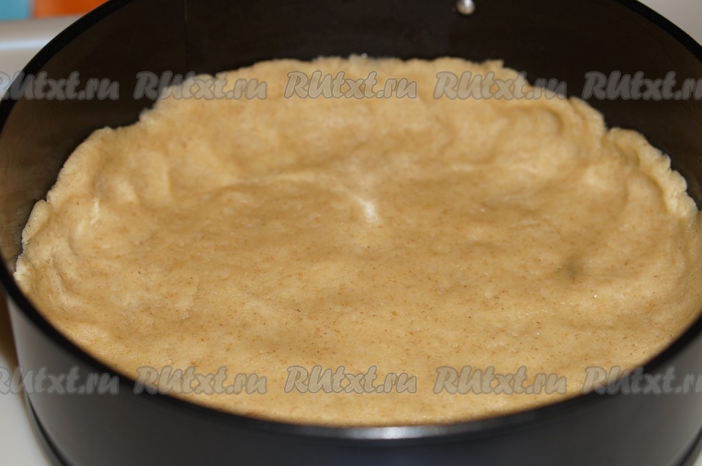 Две трети теста выложить в смазанную маслом форму. Распределить тесто по дну формы, сделав небольшие бортики.