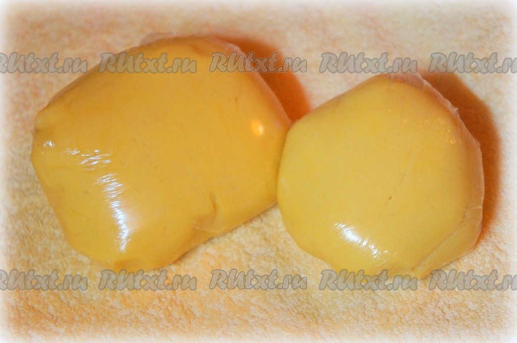 Разделить песочное тесто на две части, одна часть должна быть чуть больше другой. Скатать каждую из частей в шар, упаковать в пищевую плёнку и отправить в холодильник на 20-30 минут.