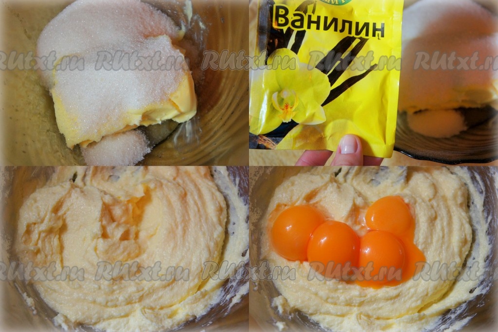 Сливочное масло для замешивания теста должно быть комнатной температуры, поэтому его заранее нужно будет достать из холодильника. Сливочное масло выложить в объёмную миску, всыпать сахар, тщательно растереть вилкой до однородности. Именно растереть, а не взбить. Добавить ванилин и охлаждённые желтки, тщательно перемешать.