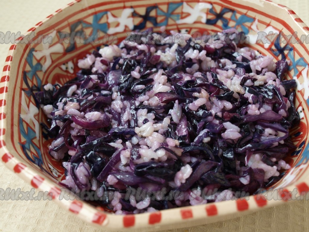 Краснокочанная капуста очень полезна, она содержит магний, калий, железо и множество других минералов и витаминов, необходимых нашему организму. Поэтому блюда с ней не только вкусны, но и очень полезны. Давайте приготовим салат из краснокочанной капусты с рисом. Блюдо получается ярким, вкусным и полезным. В тёплом виде его можно подать в качестве гарнира, а дав ему настояться в холодильнике, вы получите замечательный салат.