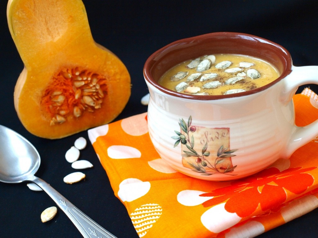 Вкусный, полезный тыквенный суп-пюре, приготовленный на курином бульоне со сливками, при подаче можно посыпать тыквенными семечками.
