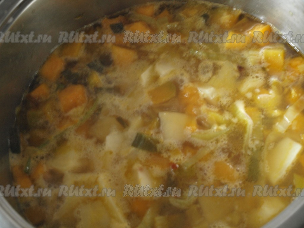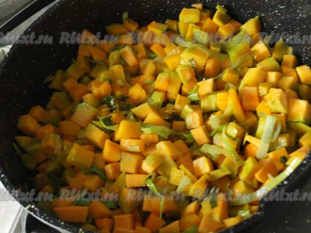 Тыкву очистить. 700 грамм очищенной тыквы нарезать на некрупные кубики. Лук-порей нарезать кольцами. В сковороде разогреть оливковое масло, выложить тыкву и лук-порей, обжарить их на среднем огне, помешивая, в течение 5-6 минут.
