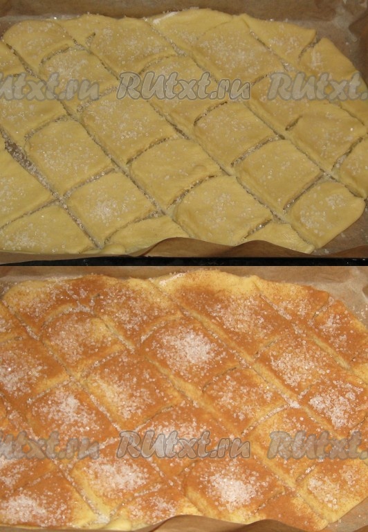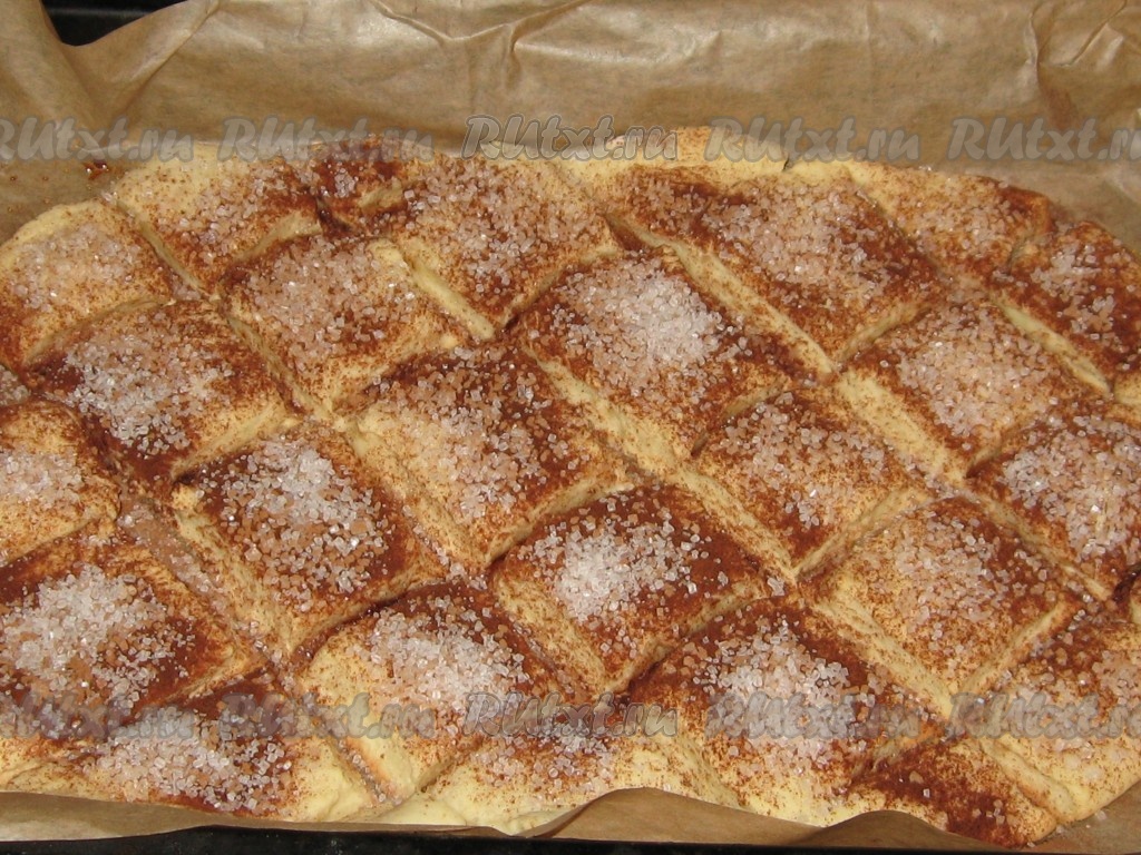 Затем тесто разрезать на квадраты-ромбы и аккуратно на пергаменте перенести на противень, сверху равномерно посыпать, чередуя сахар - корица - сахар.