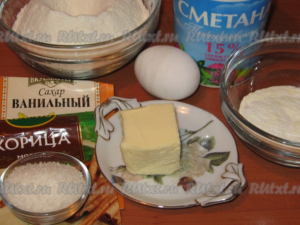 Подготовить продукты для приготовления печенья "Земелах" с корицей. Сливочное масло должно быть комнатной температуры, поэтому достать его из холодильника нужно заранее, чтобы оно успело согреться и стать мягким. Сметану можно купить любой жирности (я взяла жирностью 15%).