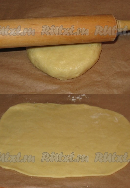 На столе расстелить пергаментную бумагу, размером с противень, выложить на неё тесто и с помощью скалки, припылённой мукой, раскатать в прямоугольник толщиной 3-5 миллиметров.