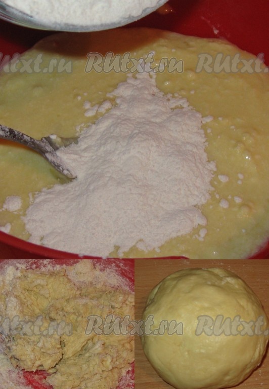 Затем постепенно всыпать просеянную муку, каждый раз вмешивая её. Постепенно замесить мягкое, эластичное, не липнущее к рукам тесто. Добавляя муку, учитывайте консистенцию замешиваемого теста, а не количество муки, указанное в ингредиентах. Завернуть тесто в пищевую плёнку (или в целлофановый пакет) и убрать в холодильник на 15-20 минут.