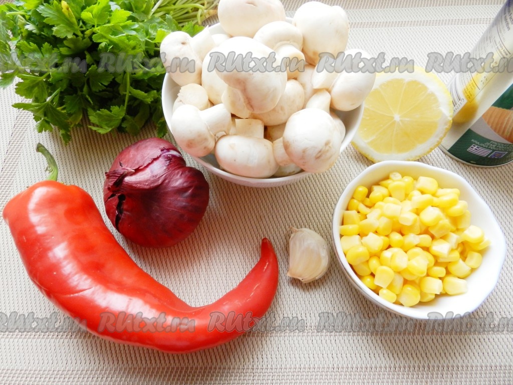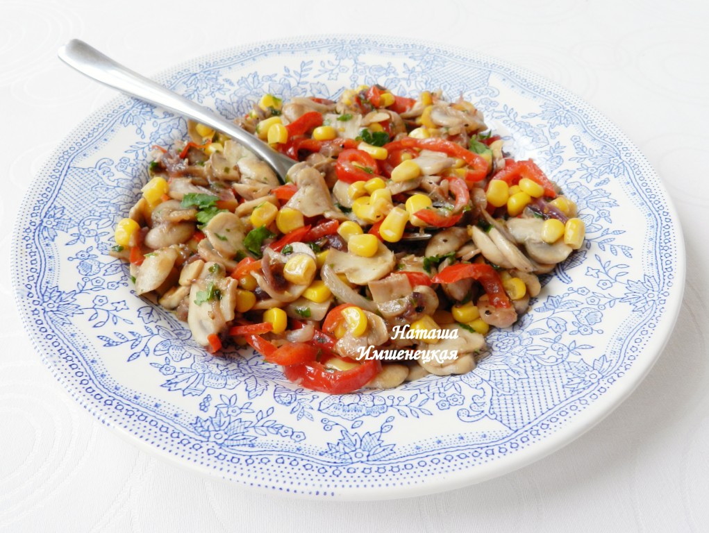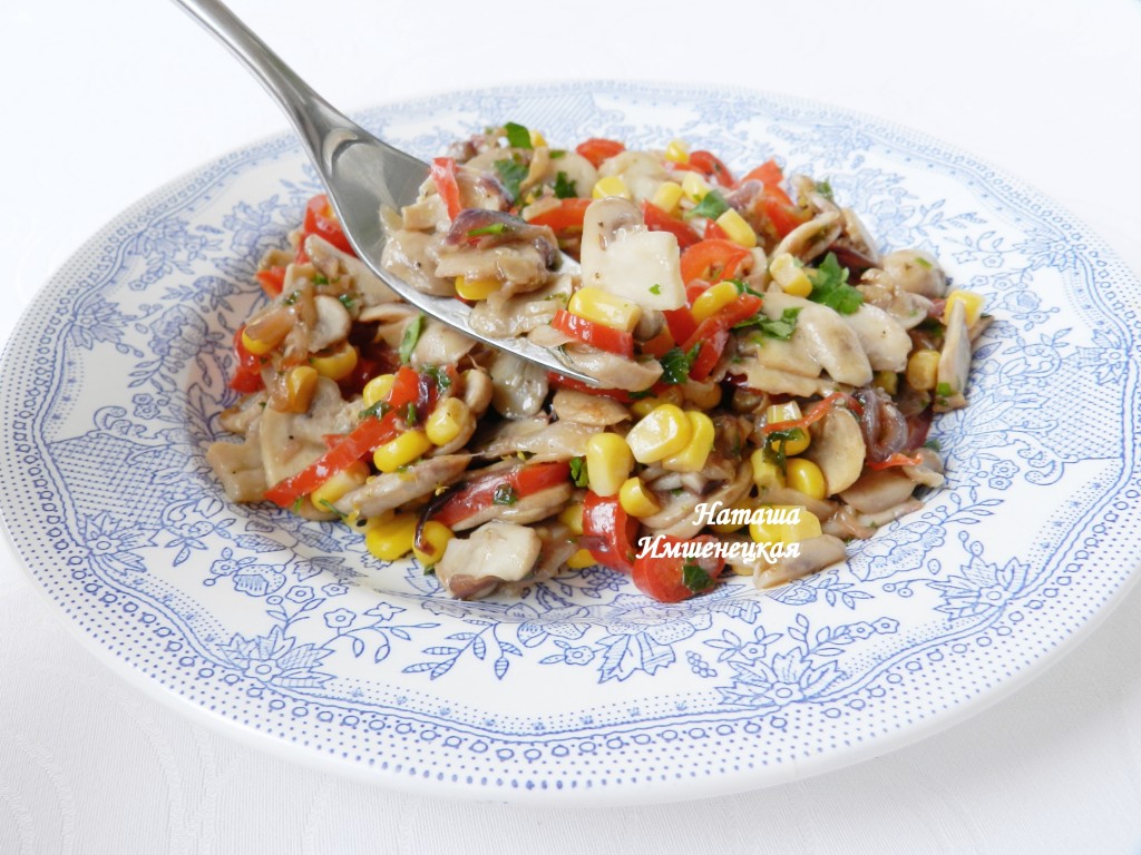 Всыпать кукурузу, перемешать. Выложить салат в тарелку, сбрызнуть лимонным соком и сразу подавать в теплом виде.