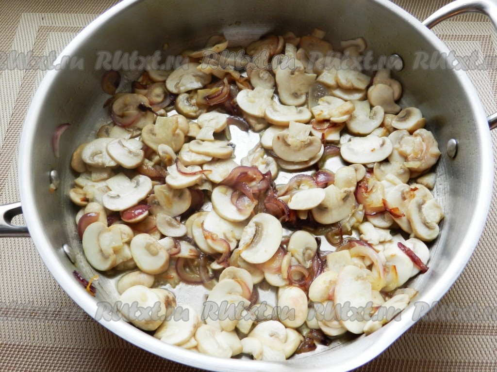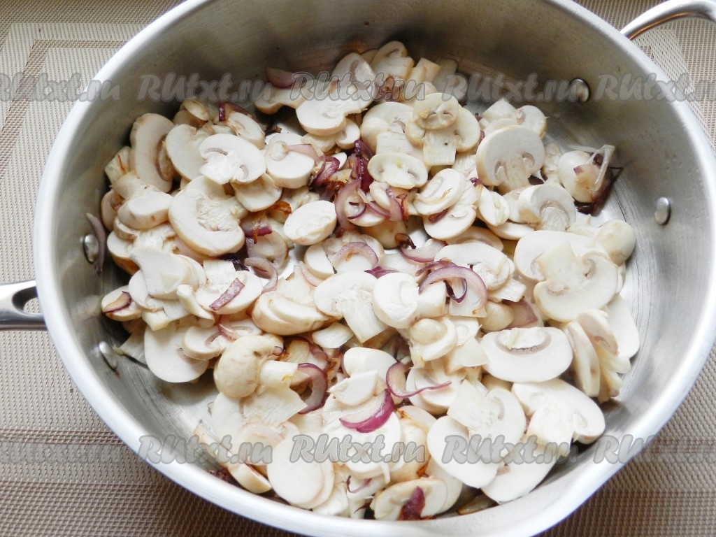 В сковороде разогреть оливковое масло, обжарить лук до золотистого цвета, добавить чеснок и еще немного обжарить до характерного яркого чесночного запаха. Затем выложить в сковороду нарезанные шампиньоны.