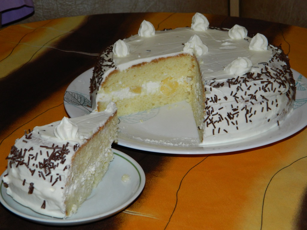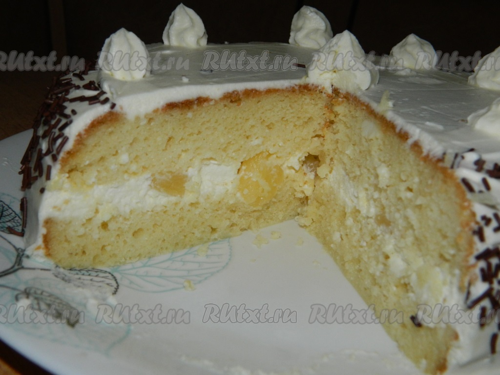 А вот какой в разрезе получился наш торт с начинкой из крем-чиза и консервированными ананасами.