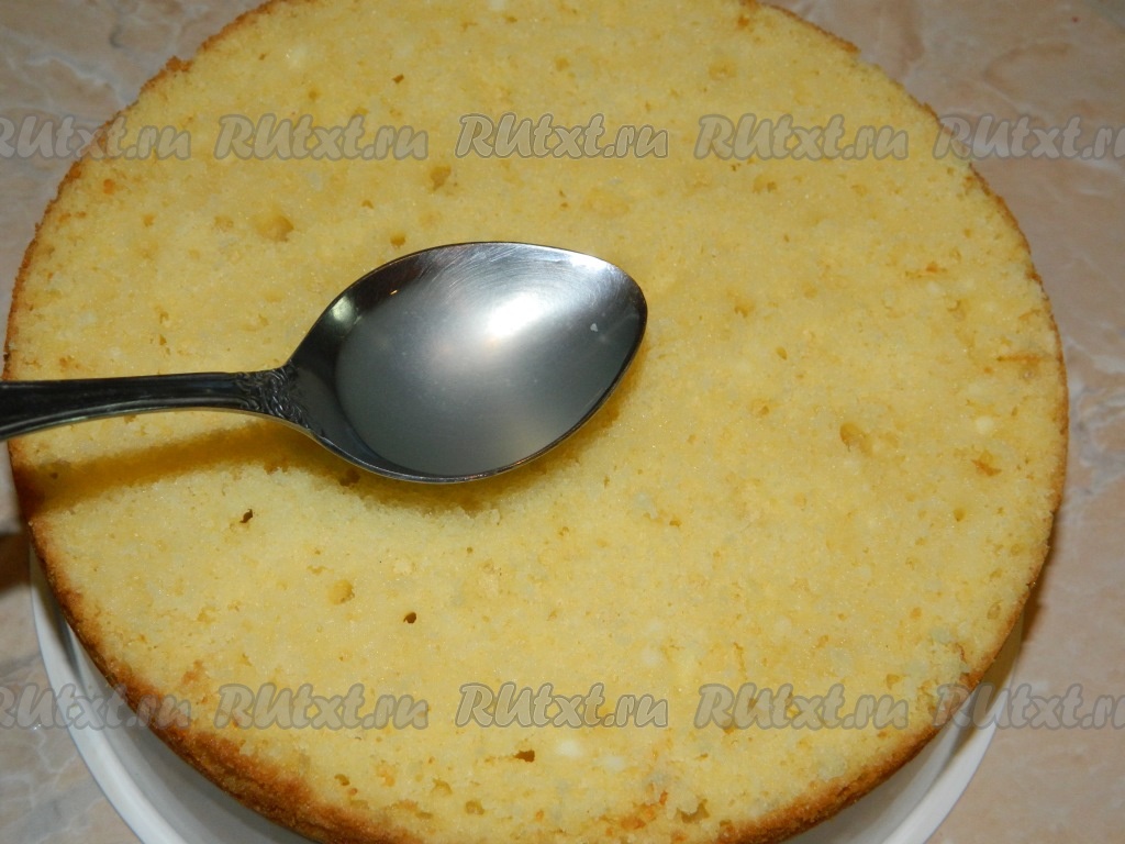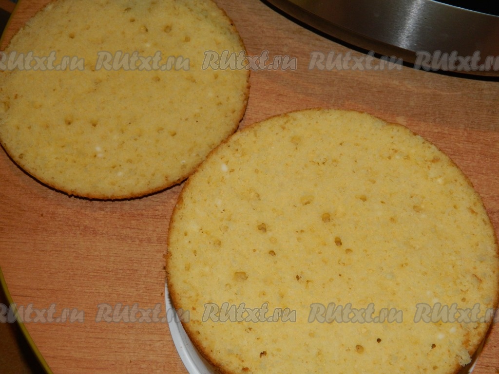 Готовый бисквит остужаем и разрезаем на 2 коржа.