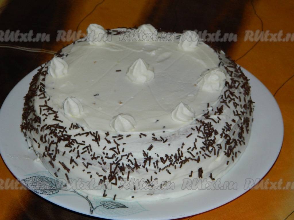 Накрываем вторым коржом, обмазываем верх и бока кремом, украшаем по своему вкусу и убираем торт в холодильник на 6-8 часов для пропитки.