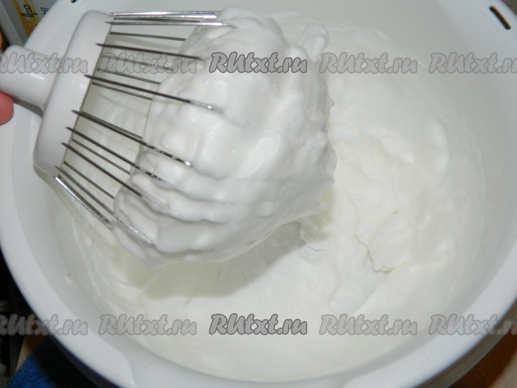 Вначале замесим тесто, для этого отделяем белки от желтков. Яйца должны быть хорошо охлаждены. Взбиваем миксером яичные белки с щепоткой соли. Отставляем в сторону посуду со взбитыми белками.