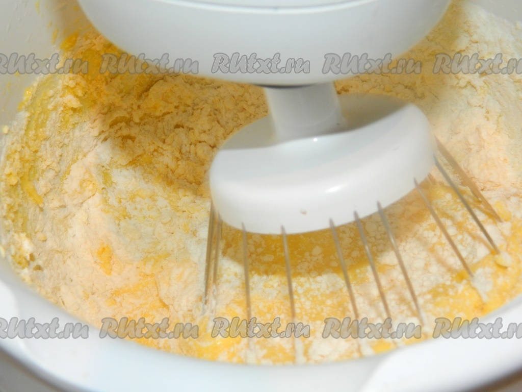 В отдельной посуде растираем миксером желтки с сахаром до бела. В смесь желтков и сахара, перемешивая миксером, добавляем растопленное до жидкого состояния не горячее сливочное масло.