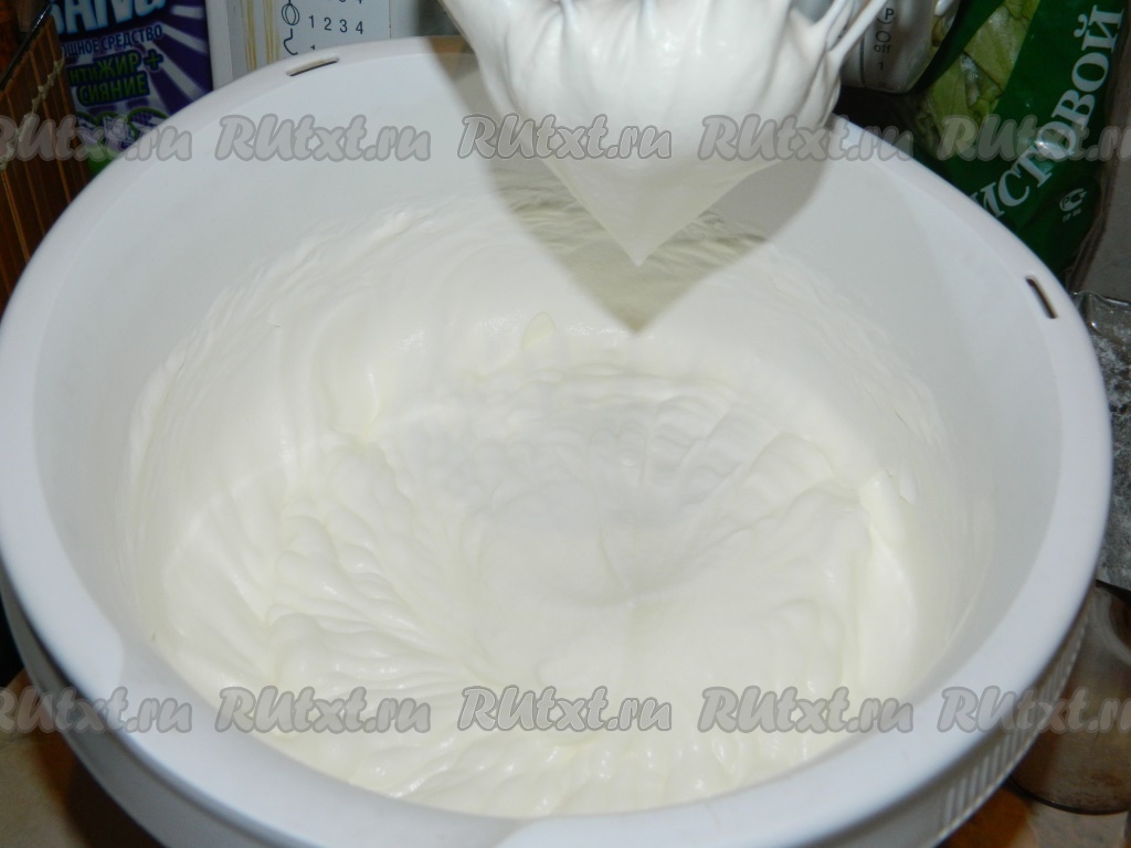 Взбиваем миксером сливки с сахаром до стойких пиков. Чтобы сливки хорошо взбились, они должны быть большой жирности и хорошо охлаждены. К сливкам добавляем сливочный сыр и перемешиваем до однородности.