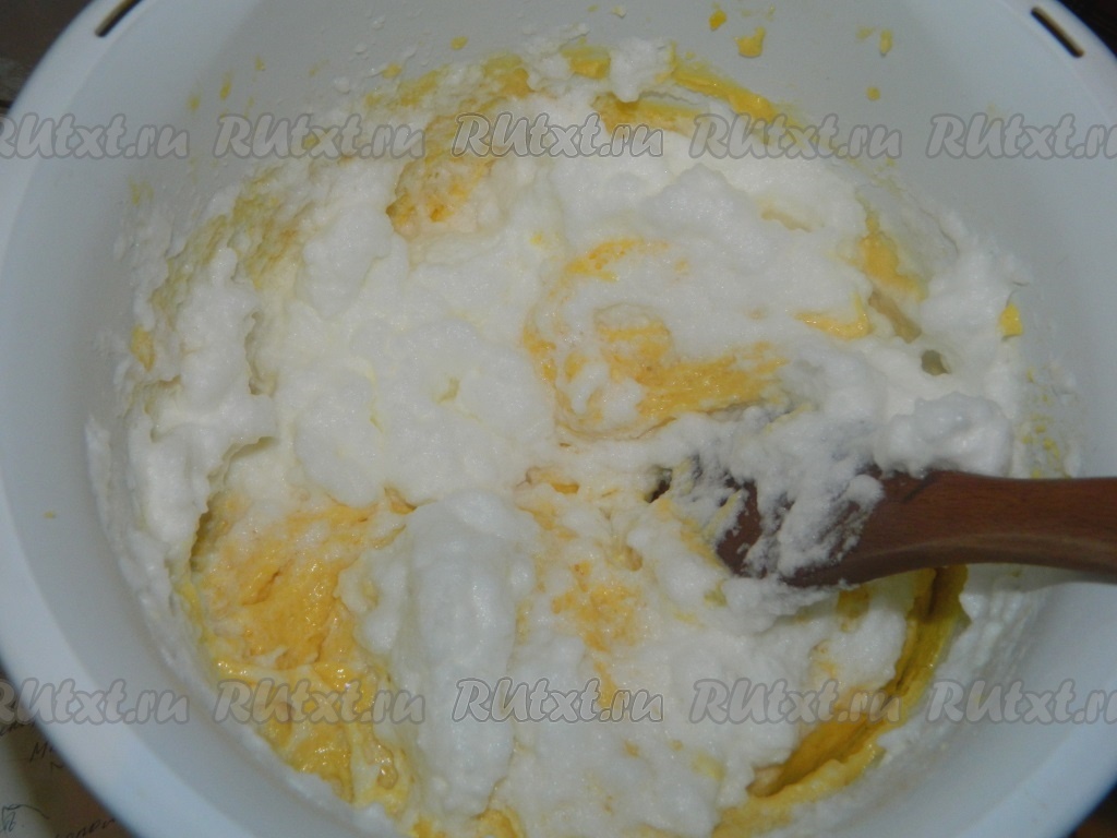 Затем добавляем взбитые белки и аккуратно подмешиваем белки в тесто с помощью лопатки движениями снизу вверх.