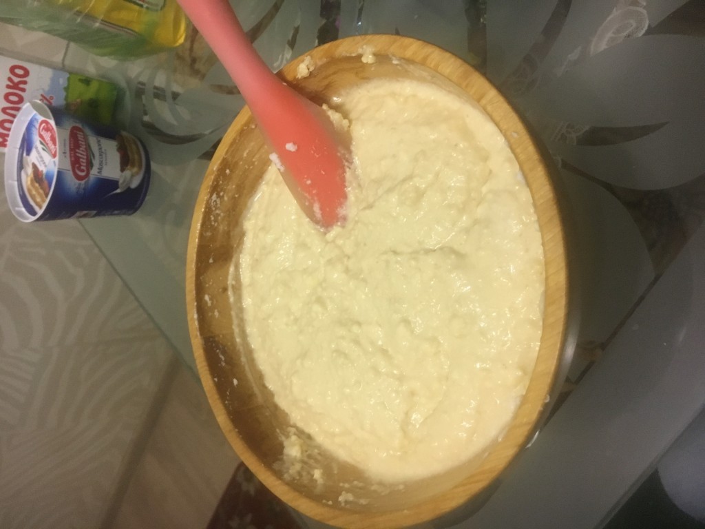 Добавляем творог, муку и соду, перемешиваем тесто до однородности.