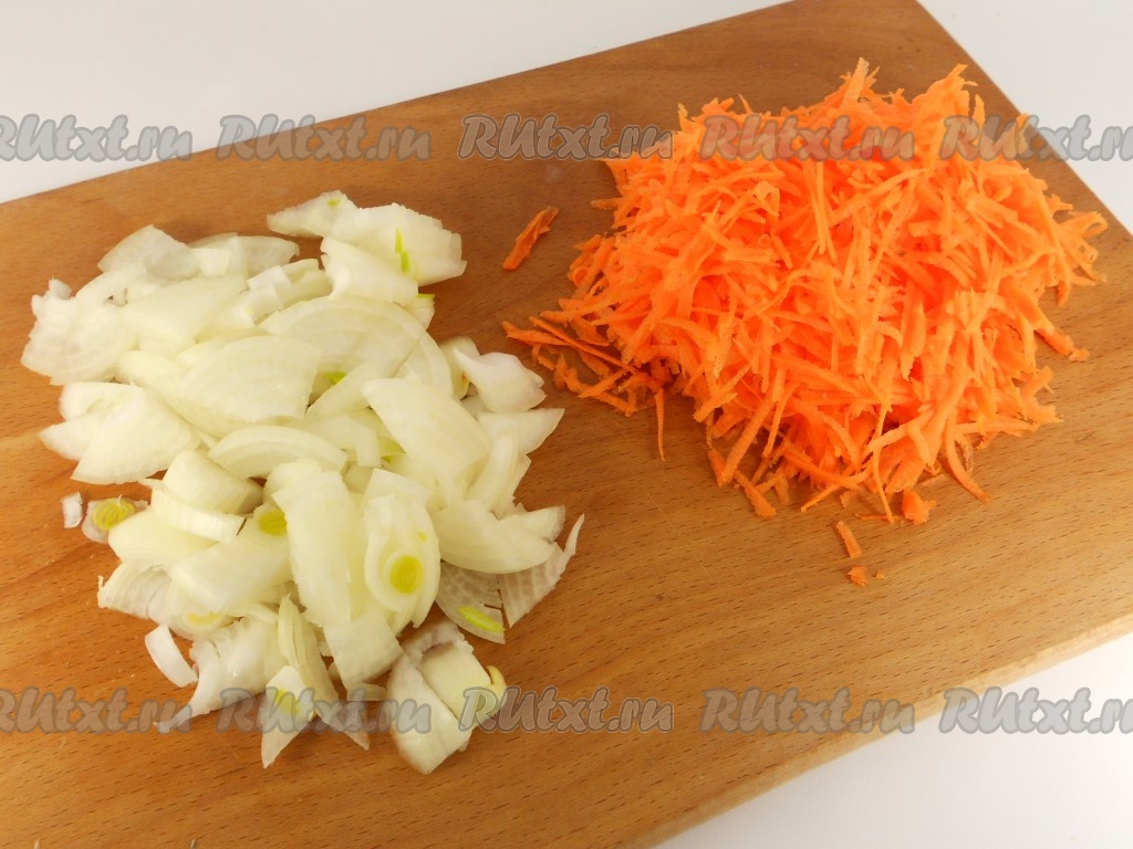 Лук порезать произвольно, морковь натереть на крупной терке.