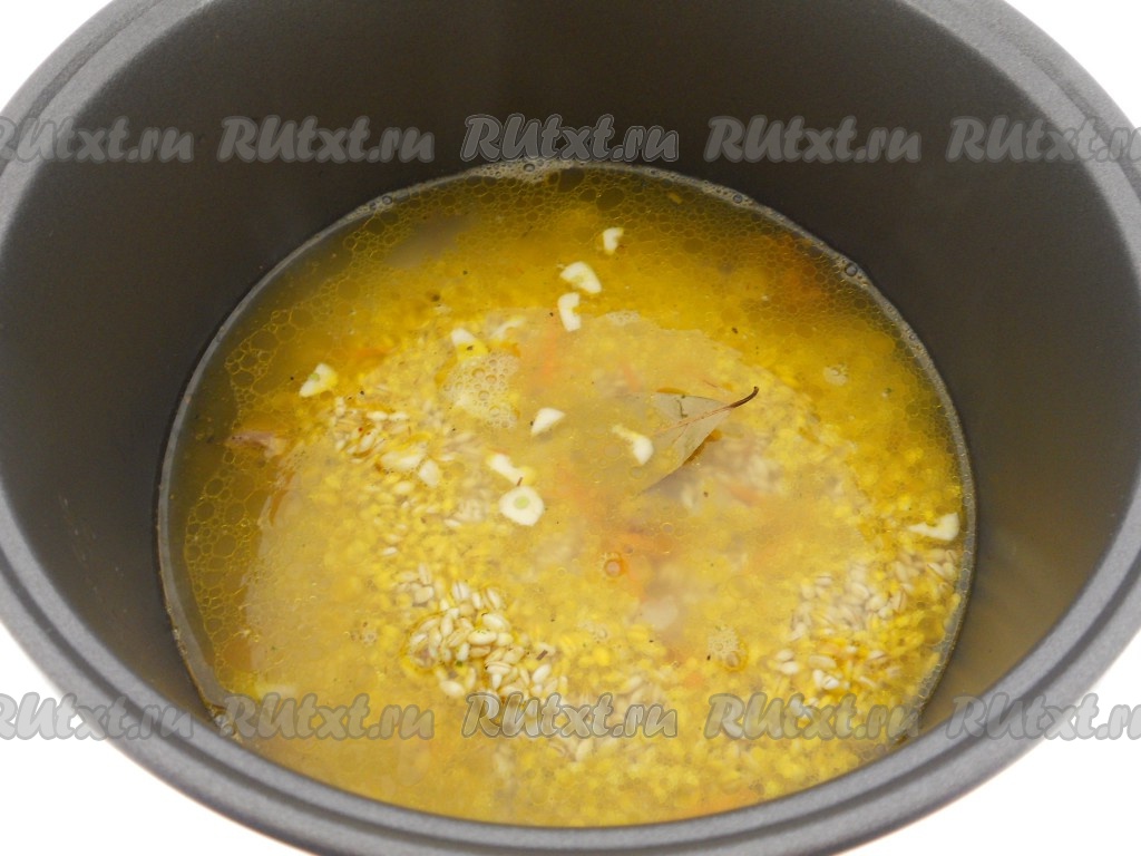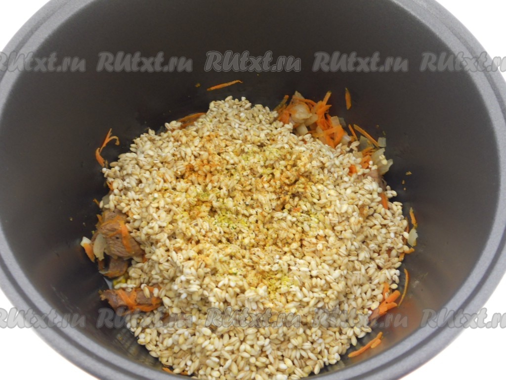 Всыпать перловую крупу, добавить приправу для плова (1-2 чайных ложки).