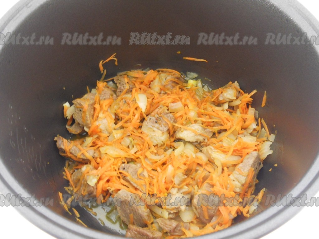 Добавить к мясу лук и морковь, перемешать и снова выставить режим "Обжаривание" на 10 минут.