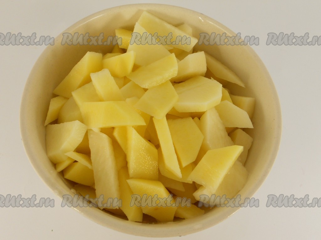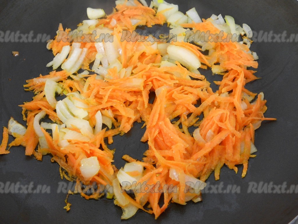 Выложить картофель в бульон, варить на слабом огне до готовности картофеля. Лук нарезать, морковь натереть на крупной терке. Обжарить овощи до мягкости на растительном масле.