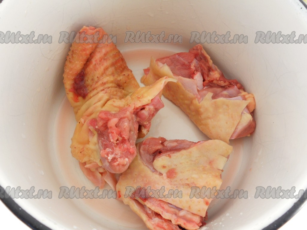 Курицу разделить на части, сложить в кастрюлю. Залить водой и поставить на огонь. Довести до кипения, шумовкой снять пену, бульон посолить. Варить домашнюю курицу на слабом огне под прикрытой крышкой минут 45 (если курица магазинная - варить 20-25 минут).