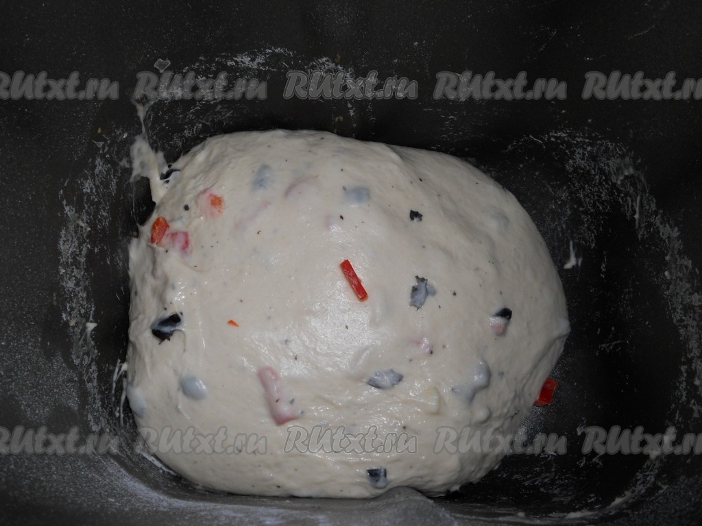 После звукового сигнала добавить оливки, перец и чеснок в тесто. Больше крышку хлебопечки не открывать!