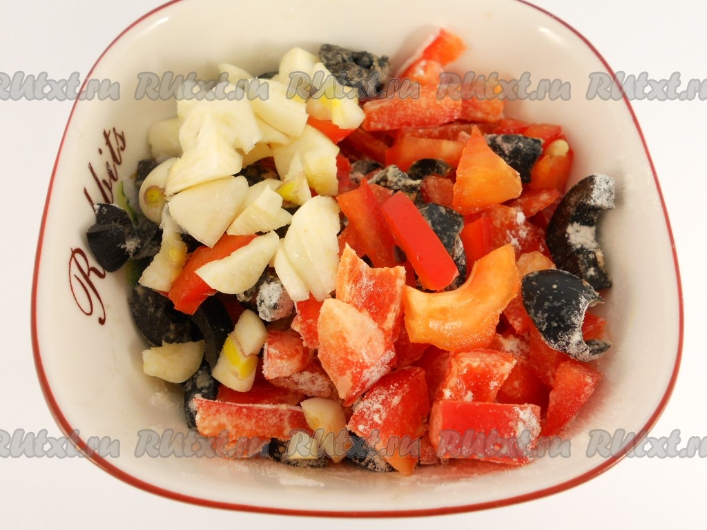 Оливки измельчить, перец сладкий порезать брусочками, чеснок - небольшими кусочками. Перемешать, присыпать мукой.