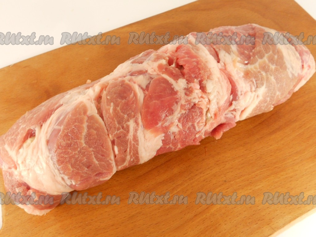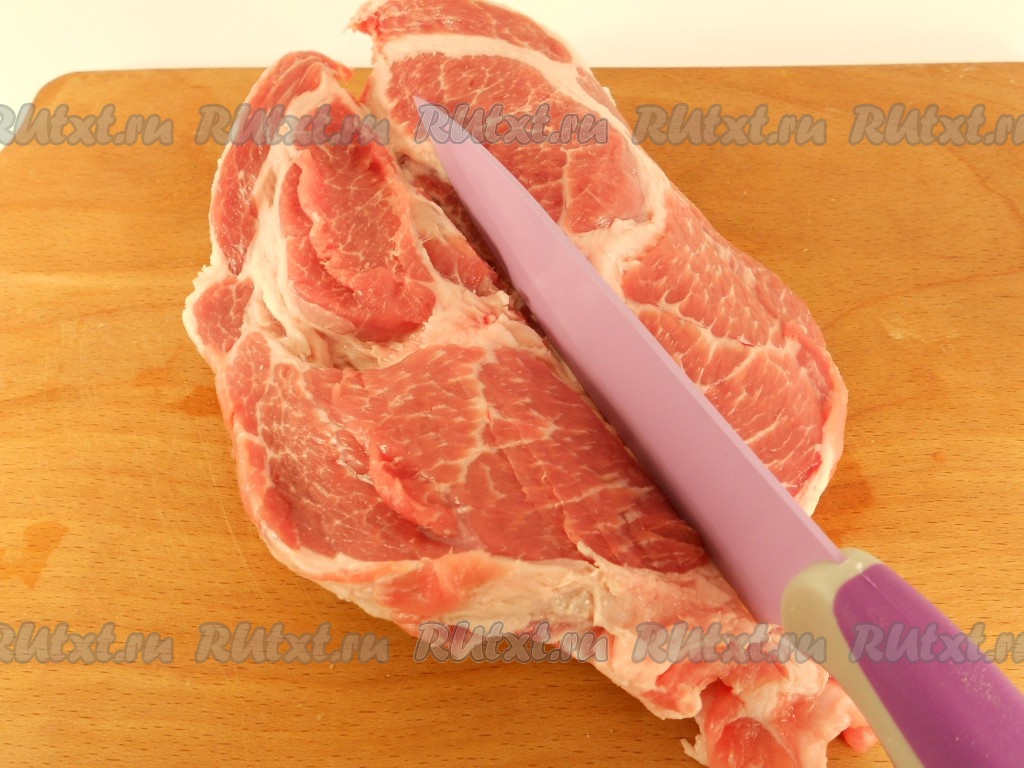Свинину вымыть, обсушить бумажным полотенцем. Сделать сверху надрез по середине, не дорезая мясо до конца.