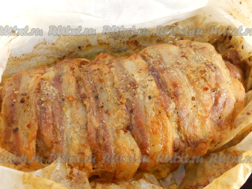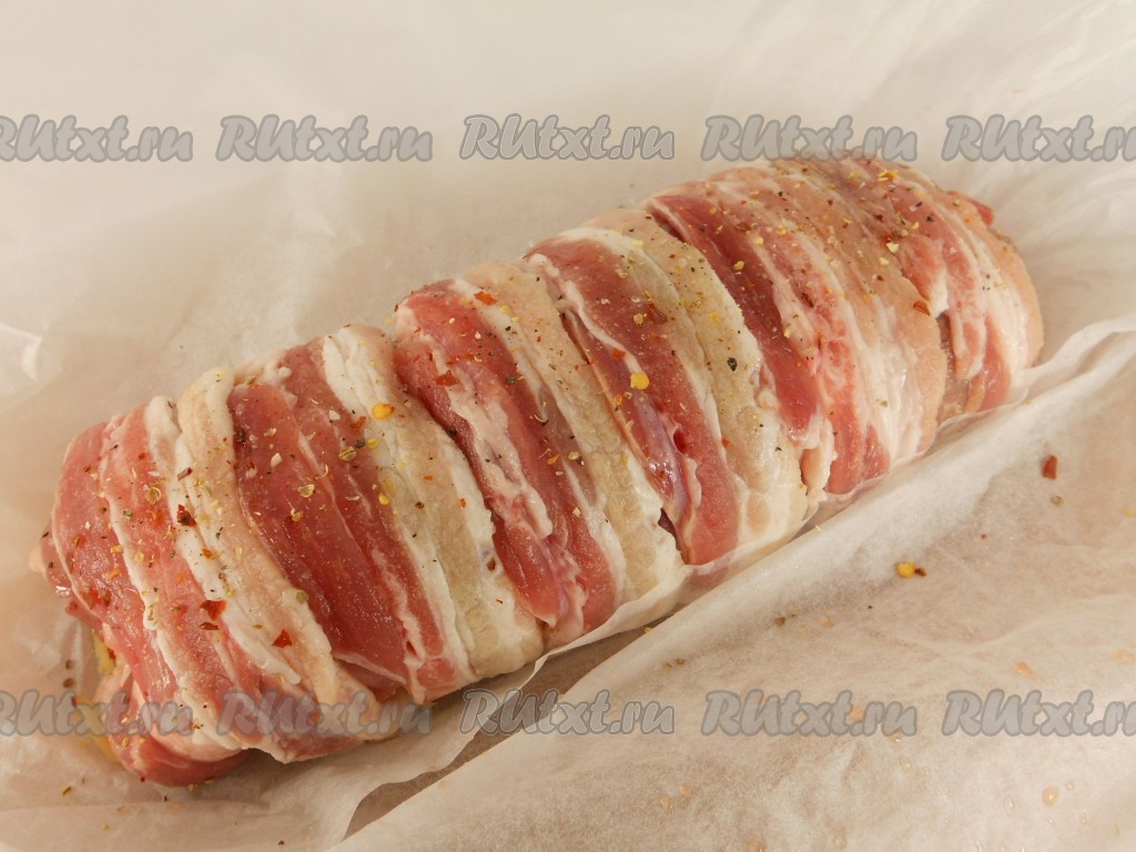 Переложить свинину с начинкой на пергаментную бумагу, поместить в форму для запекания (или на противень). Сверху мясо покрыть полосками бекона, посыпать чуть солью и молотым чёрным перцем.